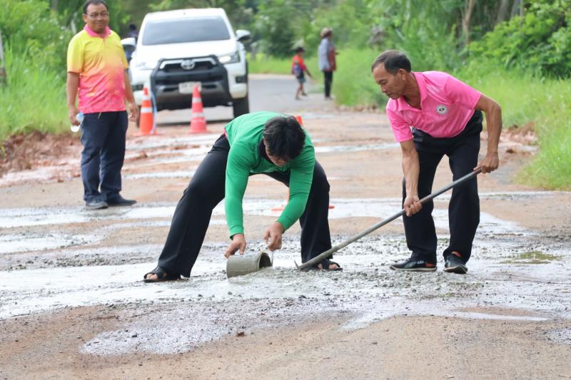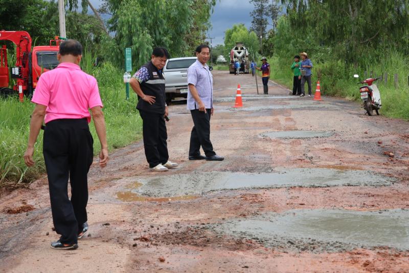 ลงพื้นที่ตรวจสอบงานซ่อมแซ่มถนนที่ชำรุดเป็นหล่อบ่อบนถนนเส้นทางบ้านหนองเม็ก หมู่ที่ 7 ไป บ้านสมพรรัตน์