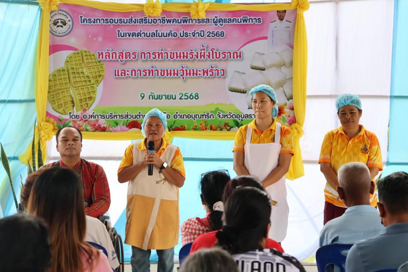 9 กันยายน 2568 เวลา 09.00 น. นายคำพูล พันพุฒ นายกองค์การบริหารส่วนตำบลโนนค้อ ได้เป็นประธานเปิดงานโครงการอบรมส่งเสริมอาชีพคนพิการและผู้ดูแลคนพิการในเขตตำบลหนองค้อประจำปี 2568 (หลักสูตรการทำขนมรังผึ้งโบราณและการทำขนมวุ้นมะพร้าว) เพื่อให้ความรู้เสริมอาชีพและรายได้แก่ผู้พิการและผู้ดูแลผู้พิการ ณ องค์การบริหารส่วนตำบลโนนค้อ อำเภอบุณฑริก จังหวัดอุบลราชธานี