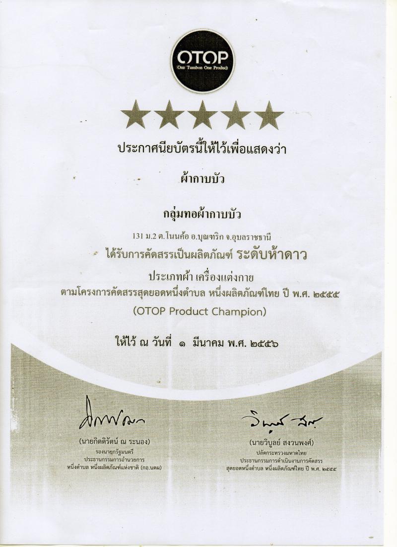 สินค้า OTOP กลุ่มทอผ้ากาบบัว ประเภทผ้าเครื่องแต่งกาย ตามโครงการคัดสรรสุดยอดหนึ่งตำบล หนึ่งผลิตภัณฑ์ไทย ปีพ.ศ. ๒๕๕๕